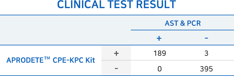 Aprodete™ CPE-KPC Kit는 카바페넴 내성 장내세균인 CPE 중에서 KPC 생성균주를 MALDI-TOF 분석으로 동정하기 위한 Kit입니다. 환자 검체로부터 1차 배양된 균 colony를 이용하여 15분 이내에 동정 결과를 확인 할 수 있습니다.
